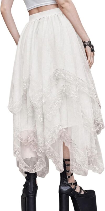 SHENHE Women’s Lace Trim Layered Mesh Tulle Skirt Price: [price_with_discount] (as of [price_update_date]) High waist Asymmetrical long goth skirt Materials: Lace, Mesh Tulle Size Chart: Small: Waist 26.8″, Length 33.5″ Medium: Waist 28.3″, Length 33.9″ Large: Waist 29.9″, Length 34.3″ X-Large: Waist 31.5″, Length 34.6″ Color: Black Features lace trim and layered design