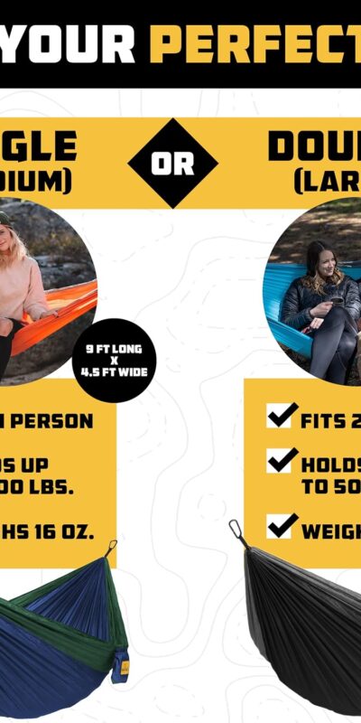 Wise Owl Outfitters Hammock for Camping Material: Made from buttery soft parachute nylon, ensuring comfort during your outdoor adventures. Weight Capacity: Supports up to 500lbs, making it suitable for a variety of users. Durability: Constructed with 210T nylon and triple interlock stitching for a strong and secure hangout experience. Portability: Designed to collapse, fold,…