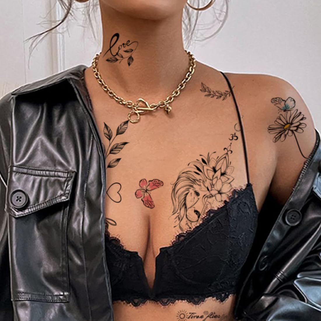 - 12 Large Sheets of Body Art Realistic Temporary Tattoos: Contains many elements like tiny flower, rose, sunflower, butterfly, dandelion, words