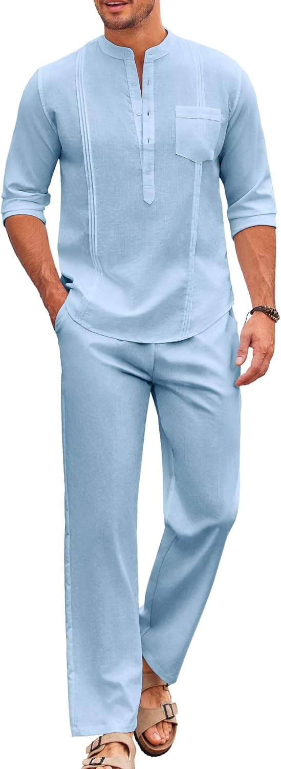 - Men’s 2 Piece Cotton Linen Set Button Down Henley Shirts Pant Sets Beach Outfits