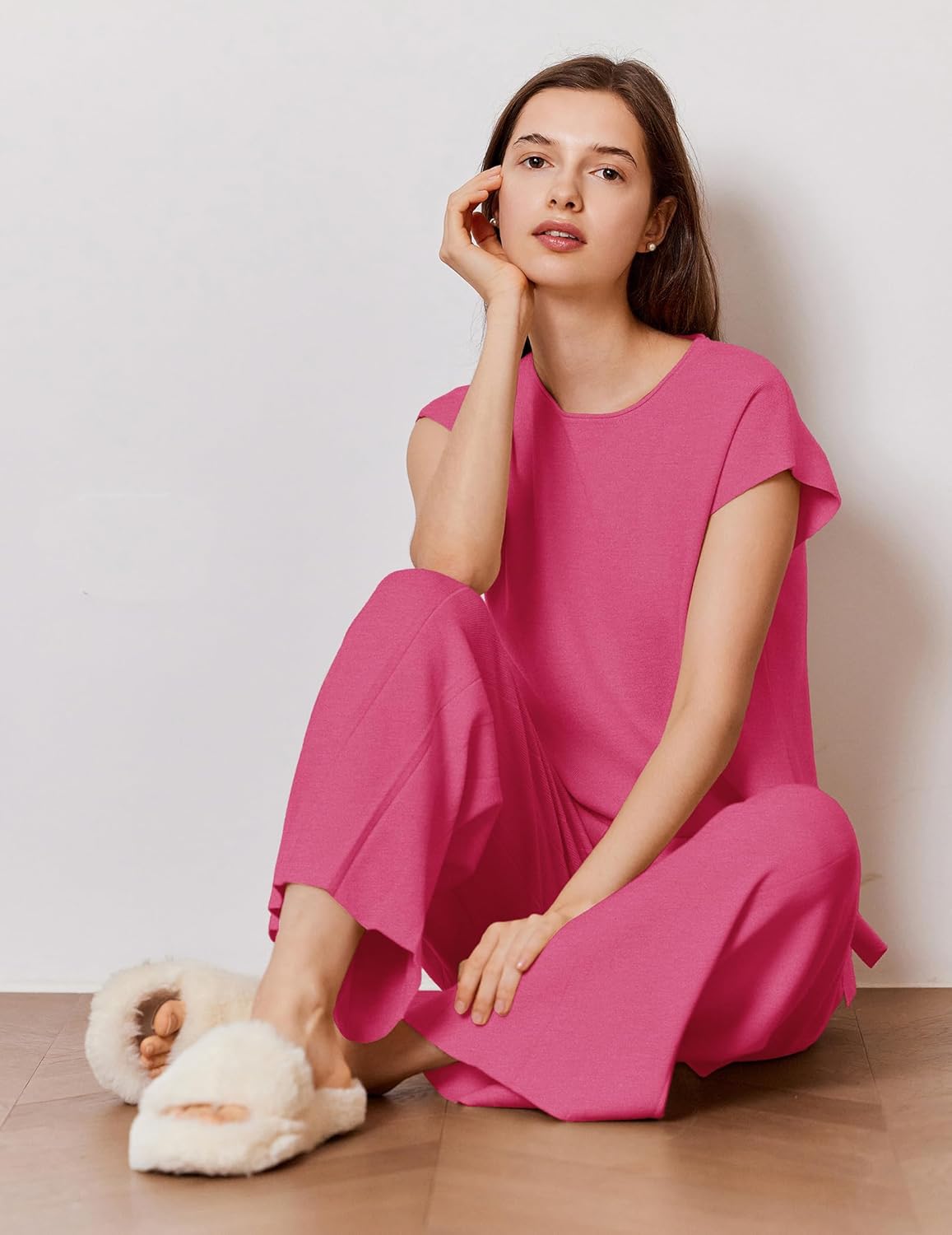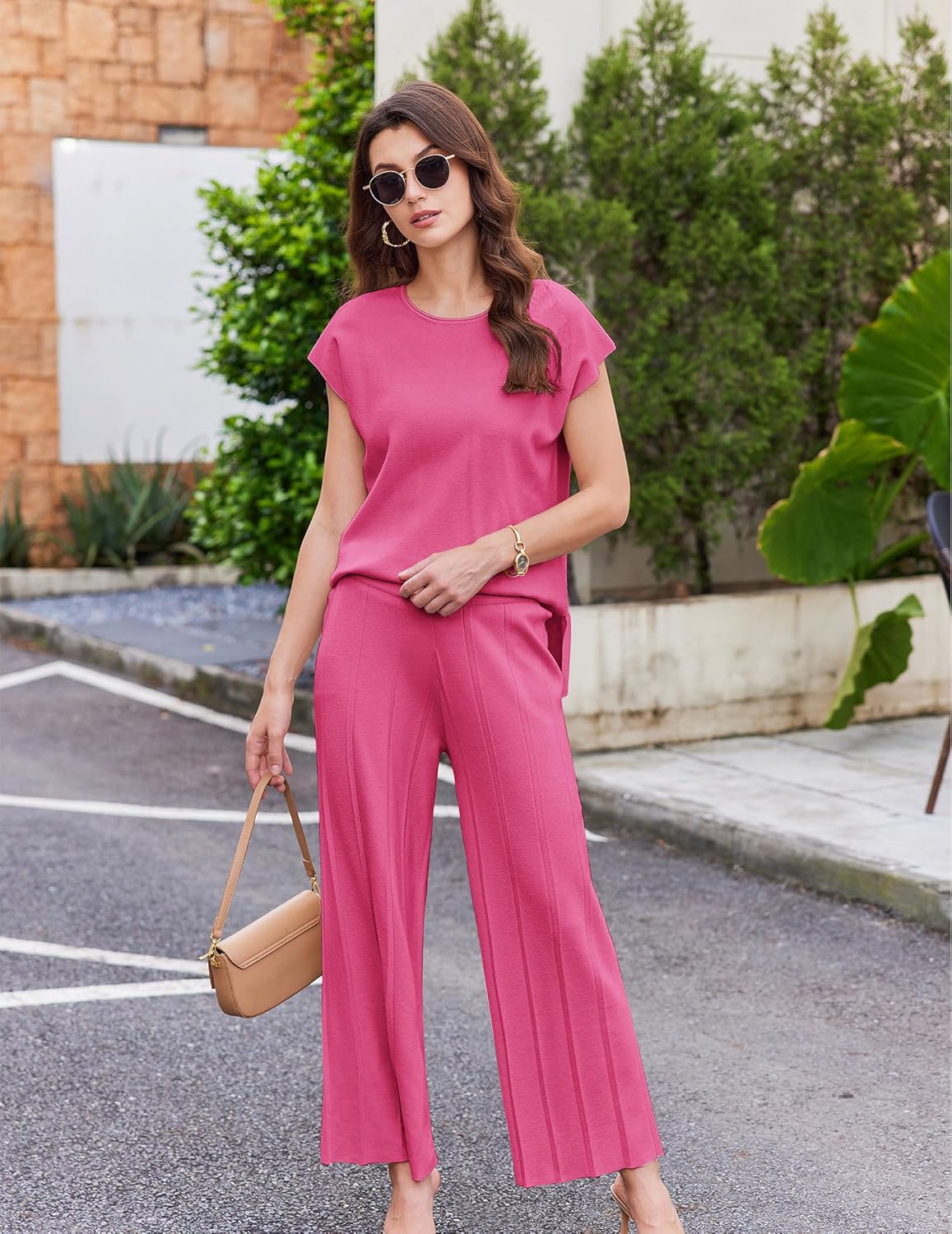 Ekouaer Lounge Sets for Women Two Piece Outfits Knit Cap Sleeve Tops Wide Leg Pleated Pants Casual Dressy Sweater Sets