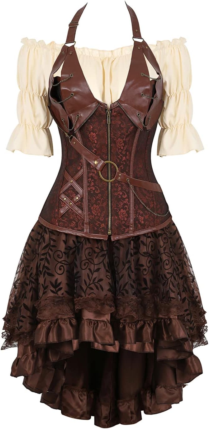 Grebrafan Steampunk Leather Corset Outfit Set for Women, 3-Piece