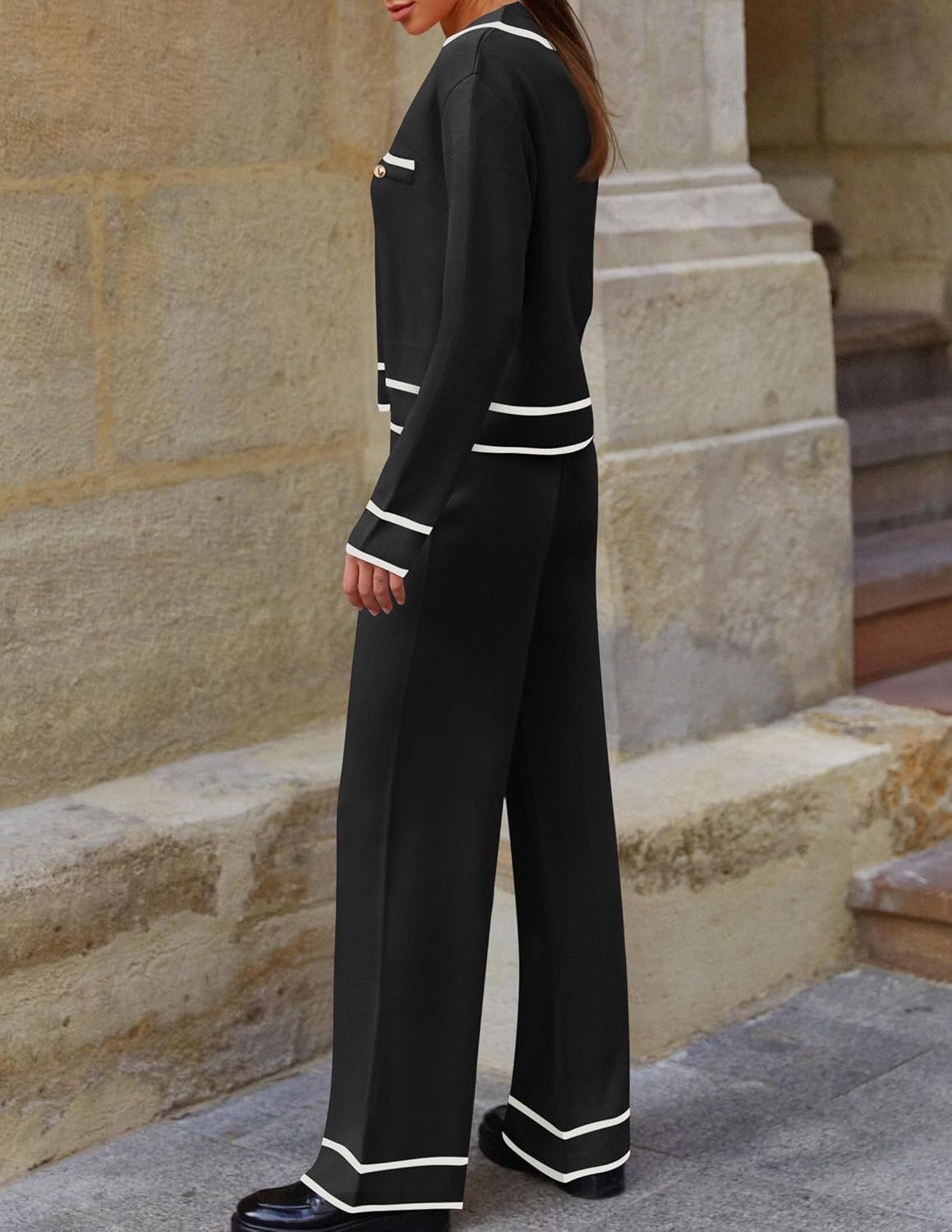 - Includes: Color block button down V neck sweater cardigan and soft wide leg pants